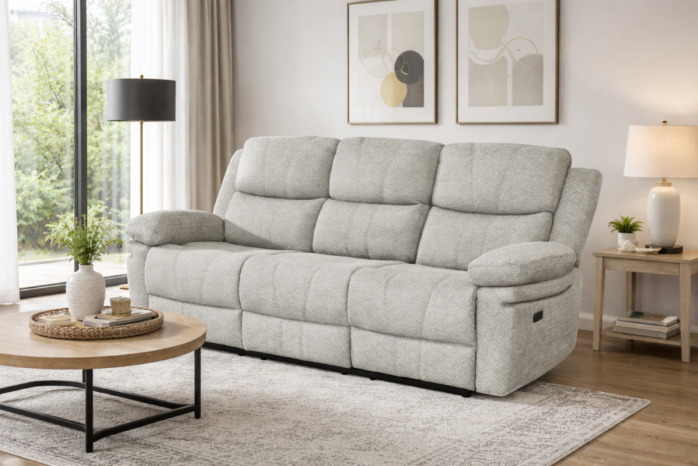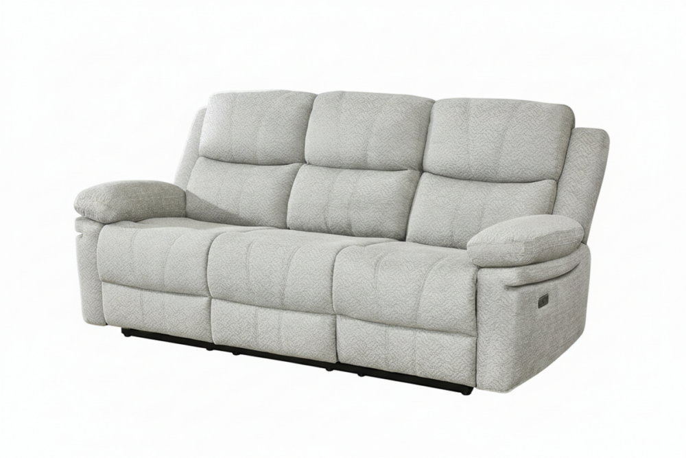 The Thea Recliner Sofa blends plush comfort with practical design, making it an inviting addition to any living room. Upholstered in soft, textured fabric, this generously cushioned sofa features high-back support and deep seating for ultimate relaxation. The dual power reclining seats allow you to kick back with ease, while the built-in center console offers convenient storage and dual cup holders—perfect for movie nights or casual lounging. With its padded armrests and clean, contemporary lines, the Thea Recliner Sofa combines everyday functionality with cozy sophistication.