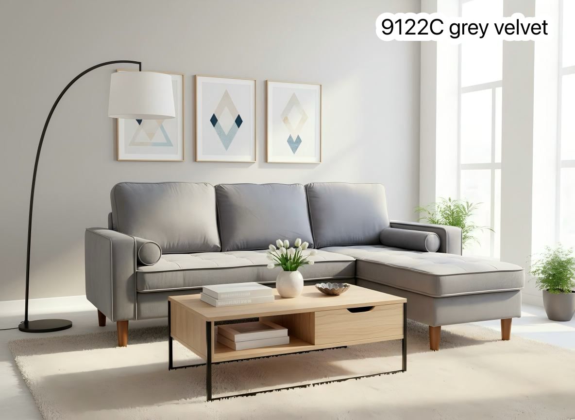 9122C Sectional Sofa Colours Black, Grey, Blue in Velvet and Linen Fabric
