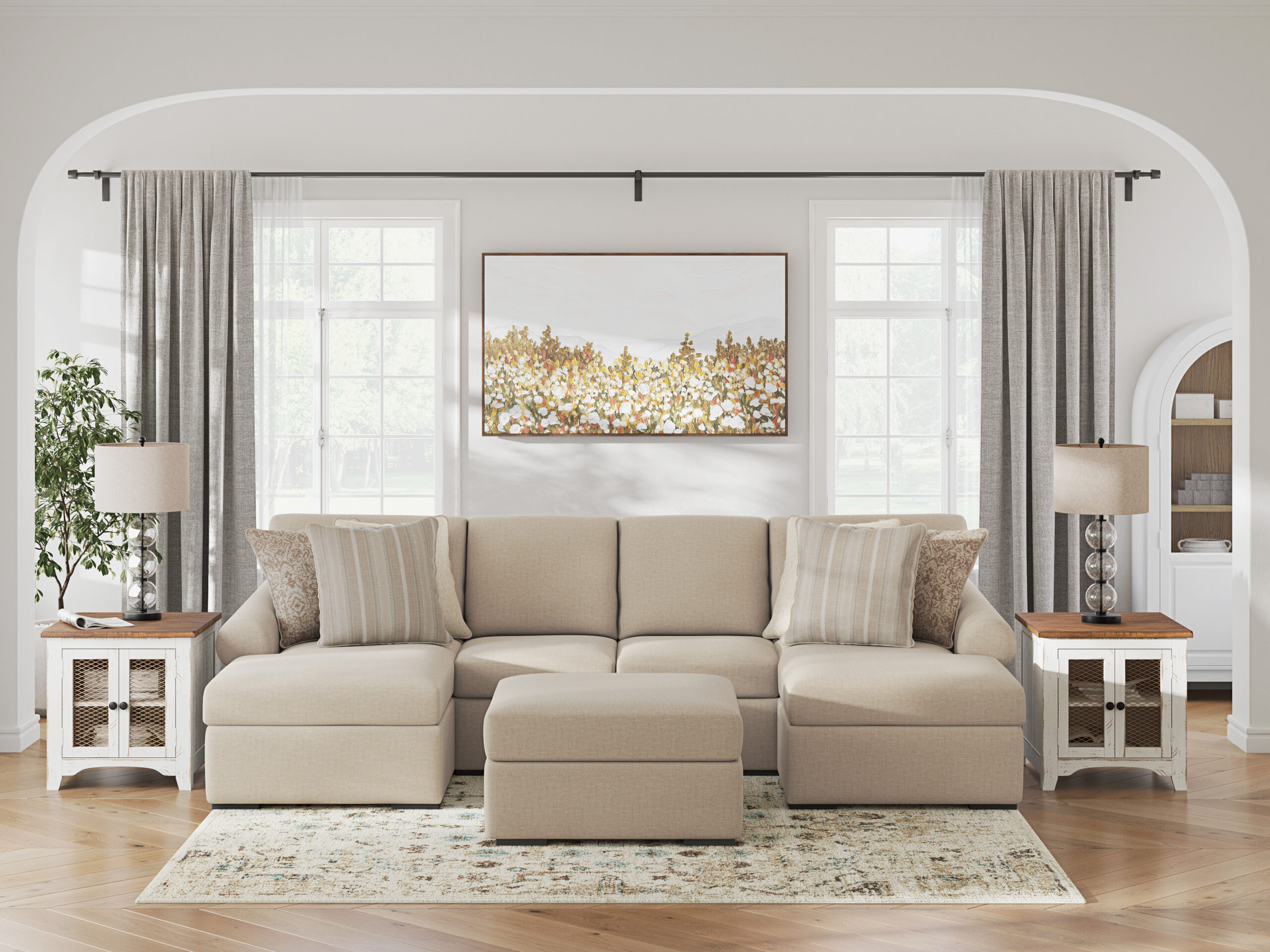 - Includes 3 modular pieces: left-arm facing corner chaise, armless loveseat and right-arm facing corner chaise