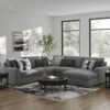 - Includes 7 modular pieces: right-arm facing corner chair, 3 armless chairs, console with storage and 2 wedges