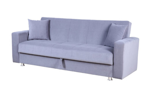 Sofabed With a Large Lift up Storage Compartment, Chrome Legs & 2 Side Pillows in a Soft Grey Fabric.