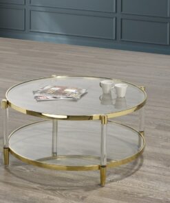 Practical functionality meets innovative design in the Brassex Coffee Table. This contemporary coffee table has clean lines and a modern silhouette that will catch your eye while complementing the existing furniture and design of your space. Featuring acrylic glass legs and a chrome finished stainless steele frame, this table is sturdy, well-crafted, and easy to maintain. This round coffee table is crafted with two tempered glass shelves that provide plenty of room to show off books, photos, plants, and other small knickknacks.