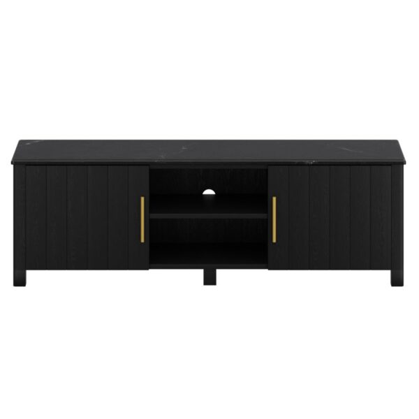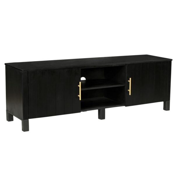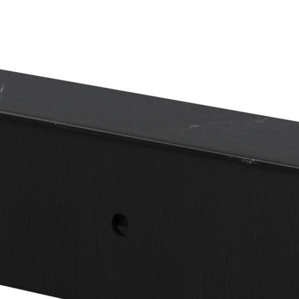 Stay organized with this stylish rustic modern media cabinet. The black solid wood construction with black marble top and aged gold handles is the perfect centrepiece for any room. Keep it freestanding in a living room for storage and display, or use in a family room as a base for the tv – all the components can hideaway neatly in the open and closed storage. Holes for cable organization make it easy to keep it all clutter-free.