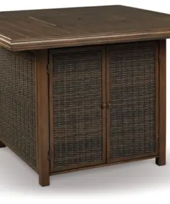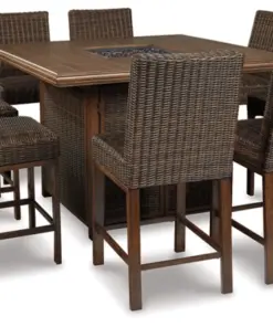 Turn your backyard space into your own piece of paradise with the Paradise Trail outdoor table with fire pit. Though this outdoor table looks remarkably like wood, it’s made of sturdy, rust-proof aluminum that’s perfectly suited for alfresco living. Enhancing the rustically refined aesthetic: side panels accented with all-weather, handwoven resin wicker. The result may look high maintenance, but rest assured, this outdoor fire pit table is anything but. With the press of a button, ignite a flickering flame that dances over a bed of glass beads. And with room for up to eight, it’s one highly accommodating outdoor bar table.
