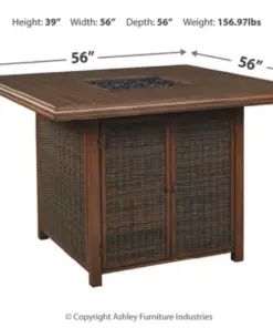 - 56″ square fire pit table with CSA-approved 55,000 BTU stainless steel burner, glass beads, burner cover and enclosed storage area with shelves