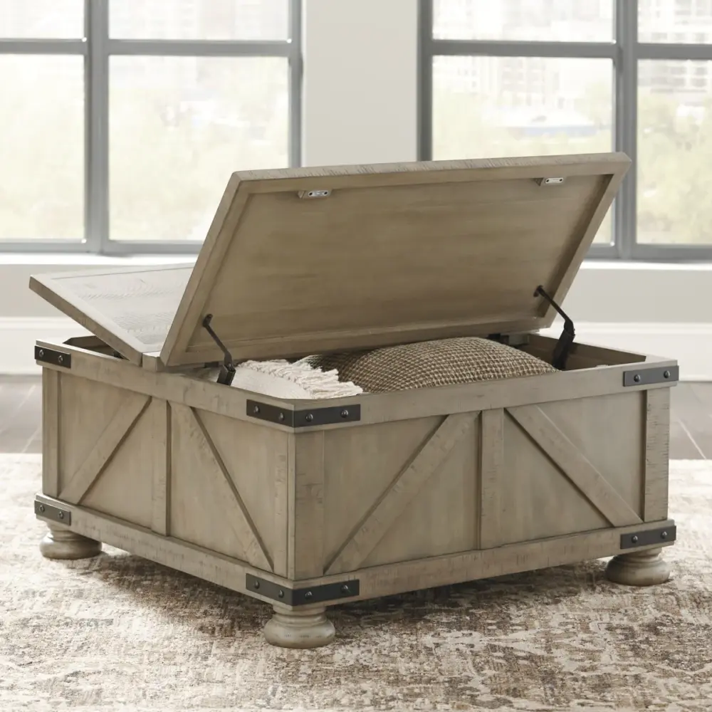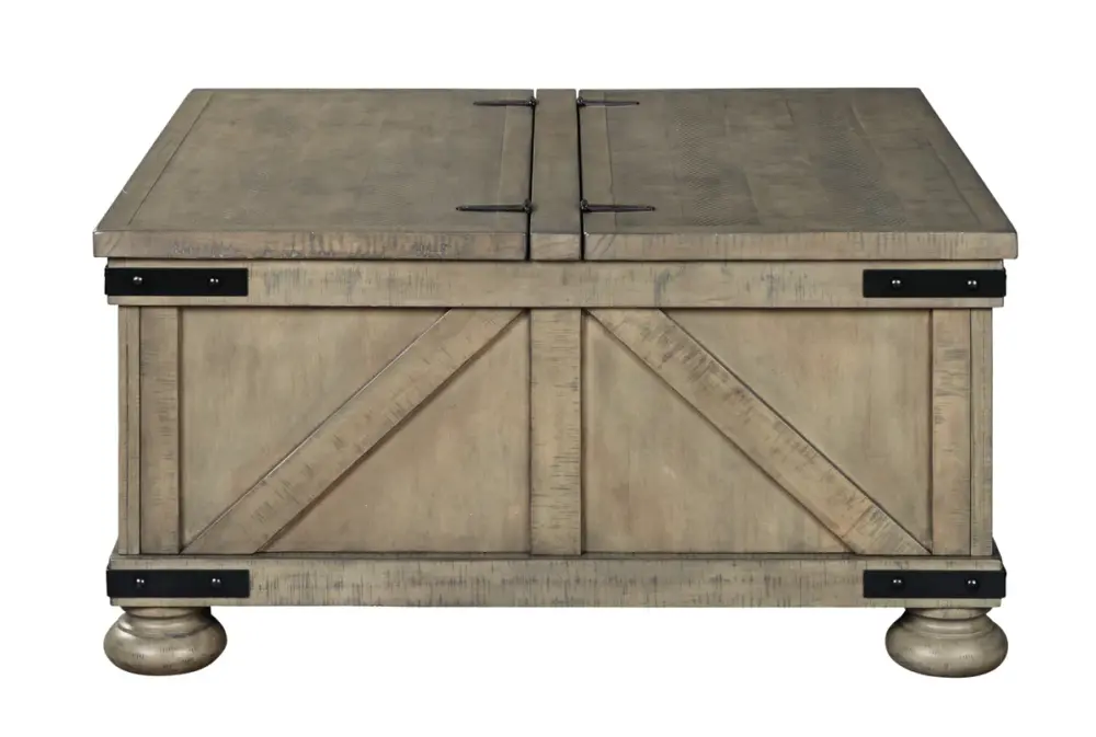 | Double up on form and function with this square coffee table with storage. Its dual lid tabletop provides easy access to the roomy storage space. Crafted with solid pine wood treated to a weathered gray finish, this generously scaled coffee table is rustic farmhouse living at its best. | ||||