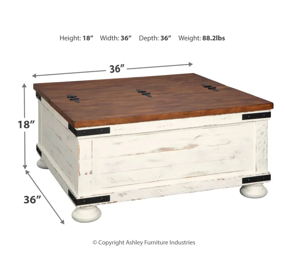 | Double take. Sporting a two-tone finish, dual-sided lid design and expansive storage space, this square coffee table takes the art of rustic farmhouse living to a new level. Designer touches include plank-effect styling, heavy distressing and industrial bracket hardware. | ||||