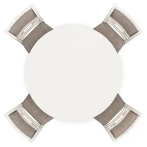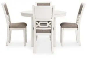 ome together for a delightful dining experience. Chic and relaxed, this dining set effortlessly captivates with its elegant simplicity. The timeless design of the table, chairs and bench pairs a crisp white hue with gray textured upholstery. It’s a fresh addition everyone will notice.