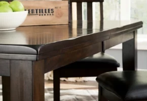 Take clean-lined, classic styling. Add modern comfort. Top with a deep, complex finish that exudes rich sophistication. That’s the look and feel of this dining table set with built-in butterfly leaf extension to accommodate guests. Six rake-back upholstered chairs make it complete.
