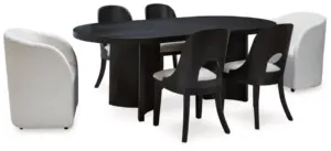 Inspired by art deco design, this dining package makes a lasting impression in a simply stunning way. Magnificent curved silhouettes are enhanced with a rich layered black finish and neutral upholstery. This set makes the contemporary statement you’ve been seeking to elevate late-night dinners and full-on family feasts.