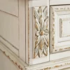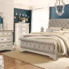 Elevating the art of traditional cottage styling, this bedroom set is your dream retreat realized. A sumptuous beauty, the upholstered bed wows with a distressed chipped white finish for heirloom appeal. Deep tufting on the cushioned upholstered headboard and footboard adds such a cozy element sure to put you at ease. Framed drawer fronts, decorative corbels, bail pulls and contrasting wood finished surfaces only add to the charm.