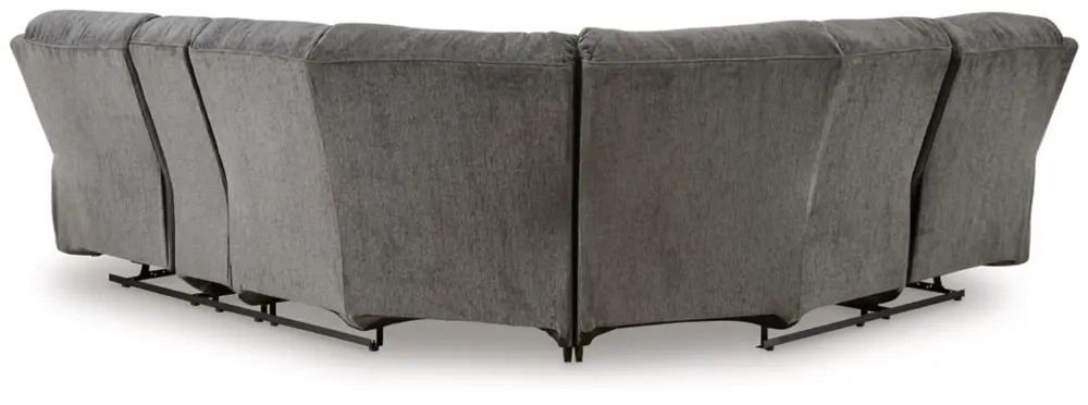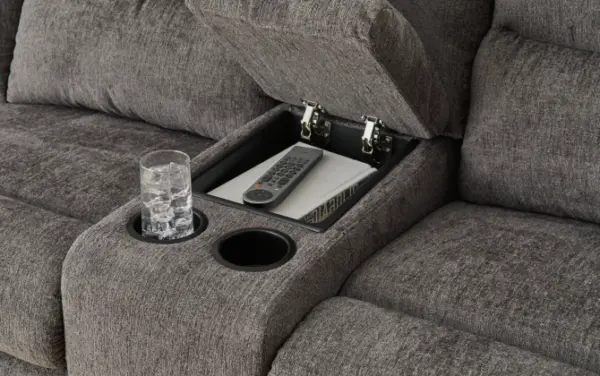 Cozy comfort is on the rise with this reclining sectional. So velvety soft, the trendy pewter-hued chenille upholstery is made for everyday indulgence. Overstuffed and stylishly wrapped, the sumptuous cushions and pillow top armrests display the comfortable side of contemporary. A padded center console with hidden storage and dual cup holders blends form and function. And with one easy pull, you’re on your way to endless relaxation with plenty of room to stretch out.