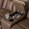 Melt into comfort at the end of your day. Accented by jumbo stitching, the supple walnut faux leather and sumptuous cushioning cradle your body in infinite positions of leisure. Simply pull the tab to recline. With dual cup holders and convenient console storage, this reclining sectional makes relaxation your sweet reward for all you do.