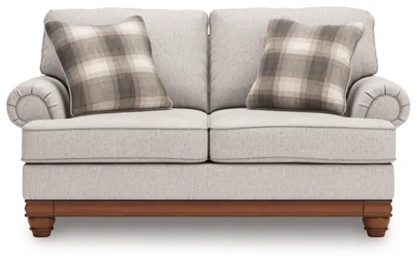 Fresh yet classic. That’s the beauty of this sofa. Dressy and also soft to the touch, its organic neutral-toned upholstery is sure to bring a transitional farmhouse aesthetic to your living space. Accent pillows in windowpane plaid and textured solid hues infuse a cozy and inviting farmhouse sensibility, while a full wraparound base and decorative turned legs complete the sofa’s timeless look. It’s the perfect place to unwind with your besties after a long day.