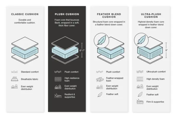 - High-resiliency foam cushions wrapped in poly fiber