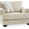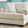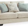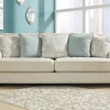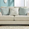 This sofa strikes a beautiful balance between classic and current. Its traditional elements include t-cushion seating and setback roll arms, angled for modern flair. Posh pillows in spa mist and jacquard paisley make a muted, mellow complement to the sofa’s casual textured chenille upholstery. And the choice of sandstone beige is a light and lovely style awakening.