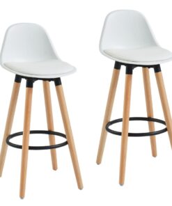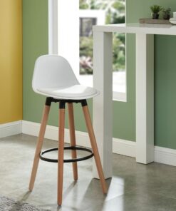 Contoured and comfortable, this counter-height stool is an easy addition to your casual kitchen counter. The plastic seat back is easy to wipe clean while the faux leather cushion adds some comfort when you’re seated for the long-haul. The solid wood legs, with their natural wood finish, provide a clean, A-line design that looks as pretty as it is functional for greater support.