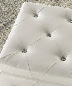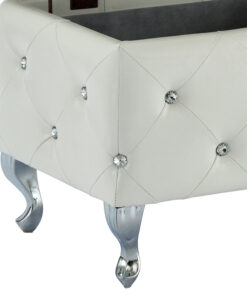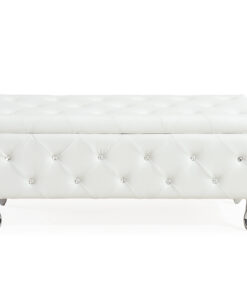 A storage ottoman can be a lavish touch to any home decor ensemble, but this ottoman is truly a one of a kind statement piece. With magnificent faux leather upholstery, a beautiful diamond patterned stitching detail, and sparkling crystal button tufting, you’ll think this piece came straight off of a fashion runway. Add to it the cabriole style legs with a chrome finish and this ottoman is sure to dazzle from any angle. Attention to detail is in all of the finishes as it includes a deep multi-purpose storage compartment and safety stop hinges to ensure that closing this ottoman will feel as soft and luxurious as it looks. Whether using it for storage or plush seating, this ottoman is sure to turn any ordinary room into something palatial. Perfect for the end of a bed to add some bling to your bedroom. Or place a clear tray on top and use as an elegant coffee table.