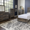When merged in just the right way, rustic and industrial styles can make one happy marriage. Case in point: the Drystan queen bookcase bed, dresser/mirror, chest and nightstand. A refined take on barn board beauty, its complex, replicated wood grain showcases hints of burnt orange and teal tones for a sense of weatherworn authenticity. Three open cubbies lined with a dimming LED light strip keep bedtime reads top of mind. Elongated metal drawer pulls elevate the aesthetic.