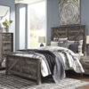This queen-size panel bed with storage, dresser, mirror, chest of drawers and nightstand is a refined take on barn board beauty. Its complex, replicated wood grain showcases hints of burnt orange and teal tones for a sense of weatherworn authenticity. Love to read in bed? You’re sure to find the pair of retro-chic light sconces and USB plug-ins on the open-slat style headboard such a bright idea. Double drawers at the foot of the bed also come in mighty handy. The chest, nightstand and dresser’s smooth-gliding drawers lined with faux linen laminate and industrial dark-tone hardware complete this rustic and industrial style bedroom. Mattress and foundation/box spring available, sold separately.