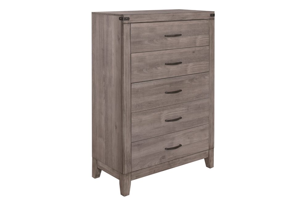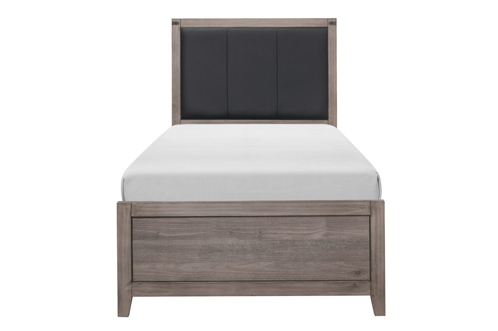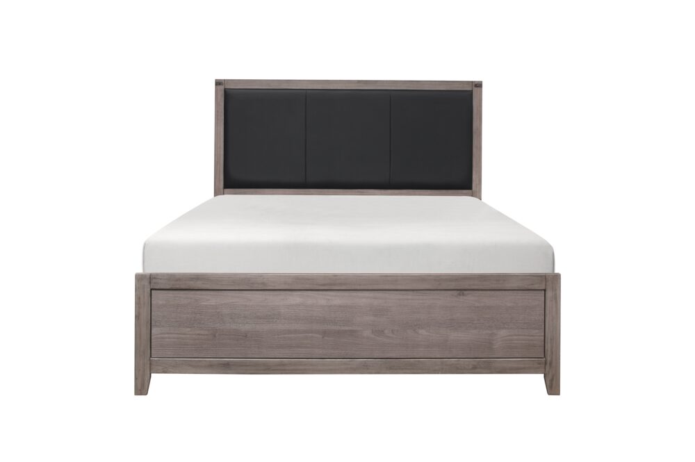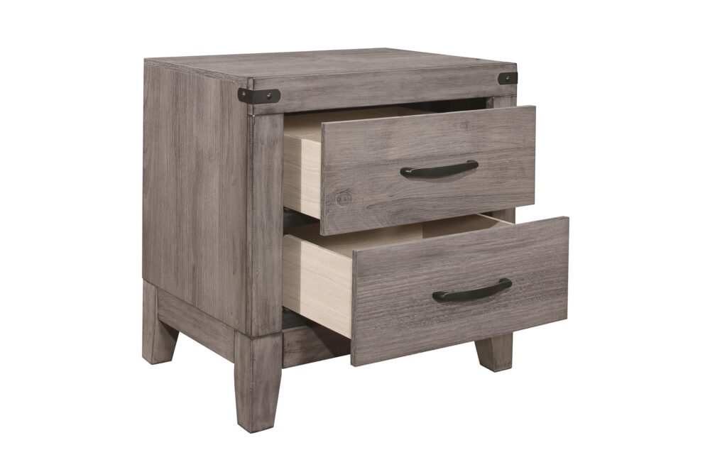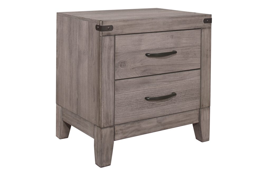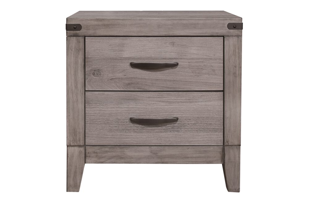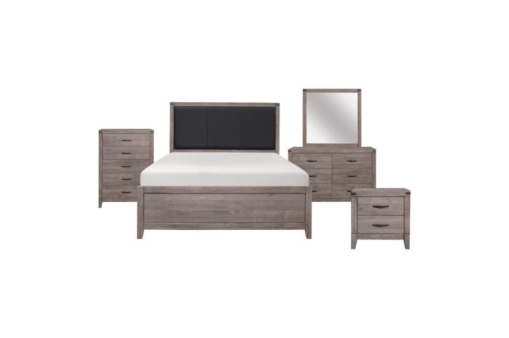 Industrial design is subtly used to achieve a cool look for your bedroom in the Woodrow Collection. Dark metal hardware and corner banding with rivet look lend to the casual look of this bedroom group. Melamine laminate features a weathered-wood look that furthers the intended design. Black faux leather accents the headboard providing distinct complementing contrast to the finish of the collection. Coordinating dining, entertainment and occasional are available.
