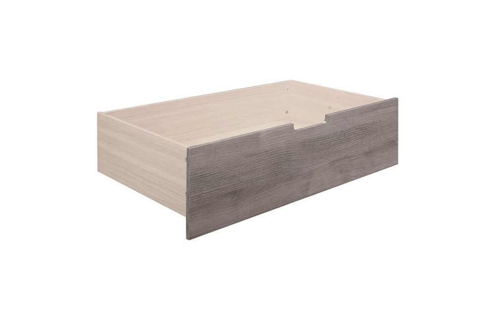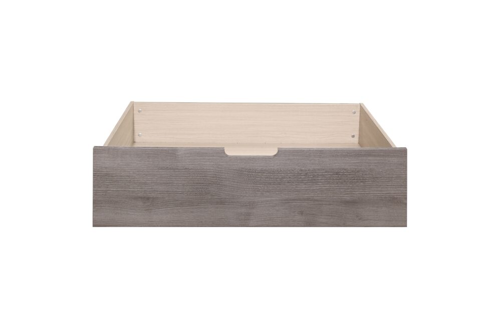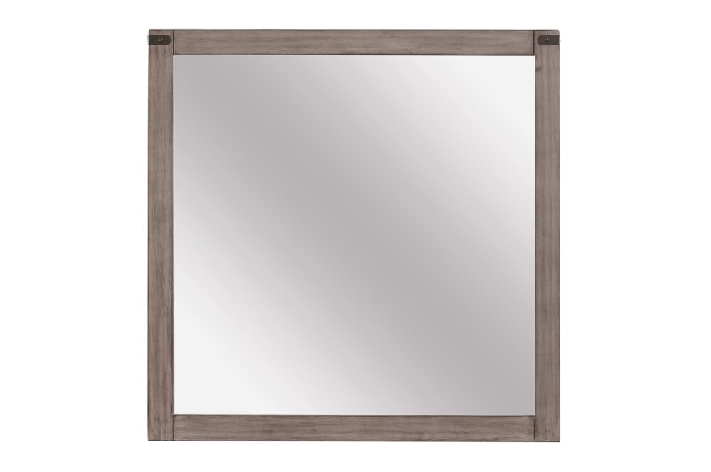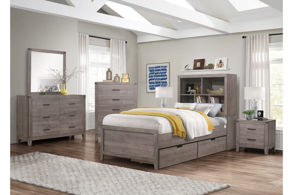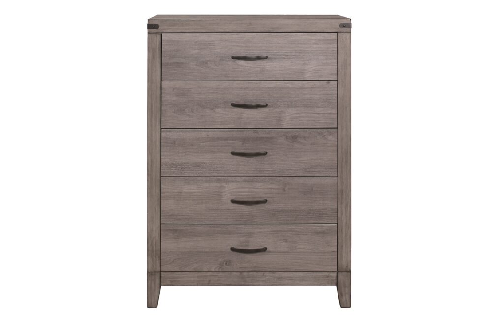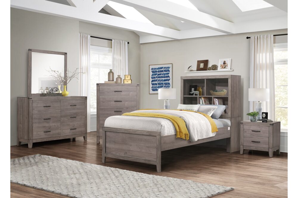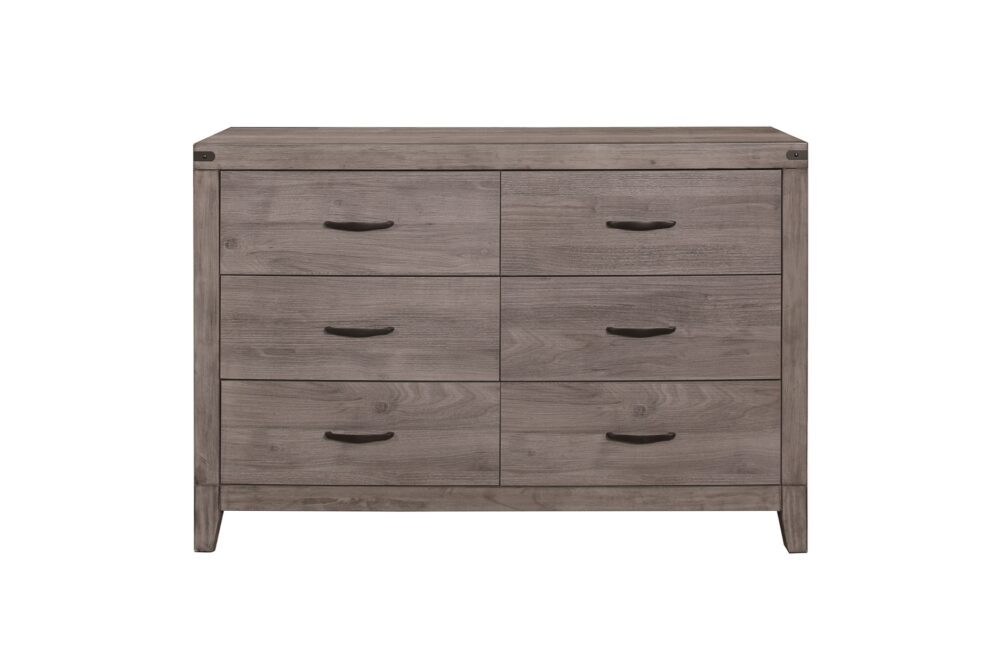 Industrial design is subtly used to achieve a cool look for your bedroom in the Woodrow Collection. Dark metal hardware and corner banding with rivet look lend to the casual look of this bedroom group. Melamine laminate features a weathered-wood look that furthers the intended design. Black faux leather accents the headboard providing distinct complementing contrast to the finish of the collection. Coordinating dining, entertainment and occasional are available.